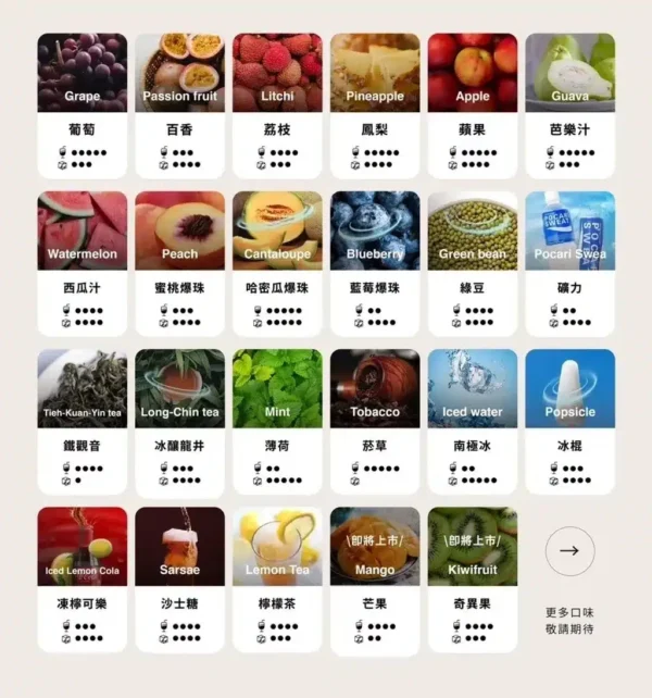 | 口味 | 葡萄, 西瓜, 百香果, 荔枝, 蜜桃, 鳳梨, 芭樂, 青蘋果, 哈密瓜, 藍莓, 鐵觀音, 檸檬茶, 寶礦力, 凍檸可樂, 沙士, 薄荷, 綠豆, 龍井, 冰棍, 南極冰, 蔓越莓, 水梨, 莓果, 奇異果, 芒果, 煙草 |